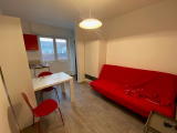 une pièce principale avec canapé/lit, armoire, table, chaises, kitchenette complète (plaques électriques + frigo), un coin douche et wc.